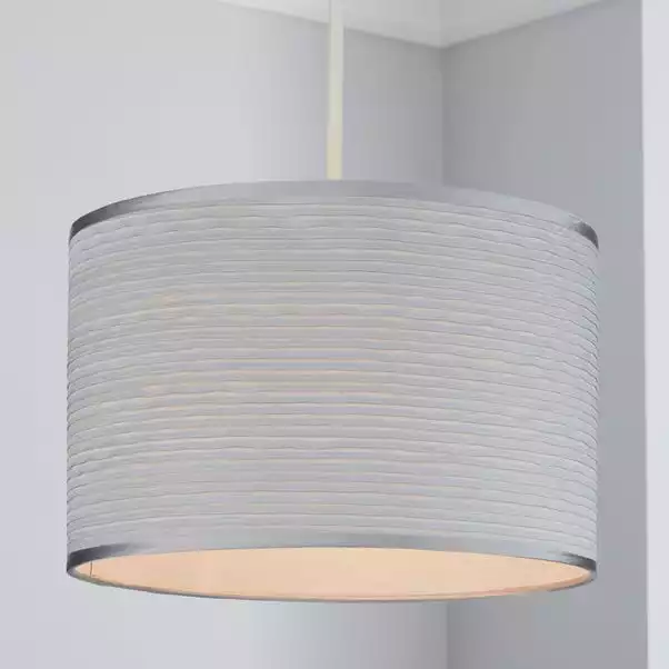 This large cylindrical pendant shade is designed with a glossy satin fabric, ripple like texture and is available in a silver colourway.