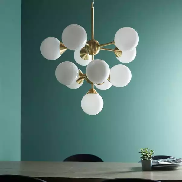 A timeless and modern design with a ‘mid-century’ feel, the impressive Elberton Chandelier is at home in both modern and classic interiors. This light fitting is finished in an ‘on-trend’ brushed brass finish, paired with gloss white glass shades and suspended from height adjustable thin wire cable with clear flex.