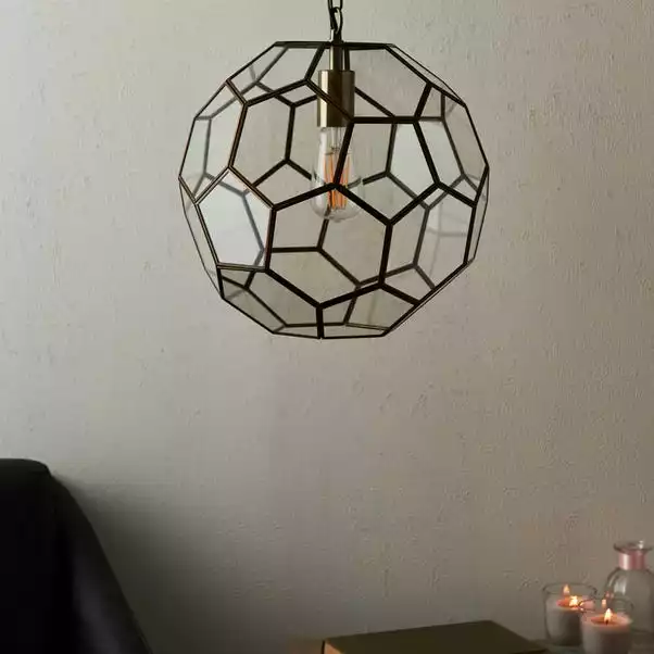 Make a bold statement in your home with this striking hexagonal design. The Vogue Hillier incorporates hexagonal glass panels edged in antique brass, complete with a height adjustable decorative chain. This light is dimmable and suitable for use with LED lamps. A unique design that will instantly transform your interior.