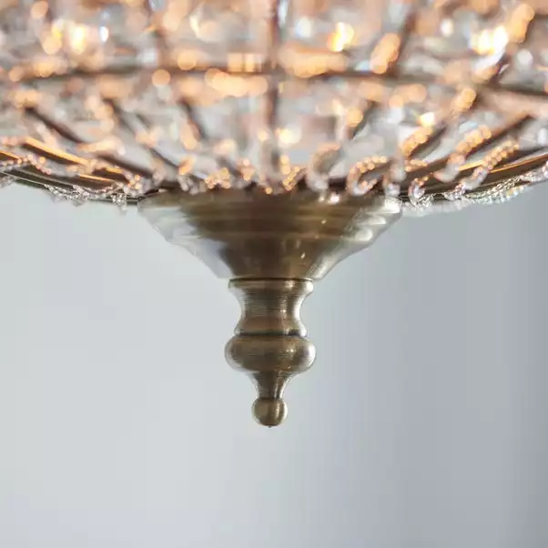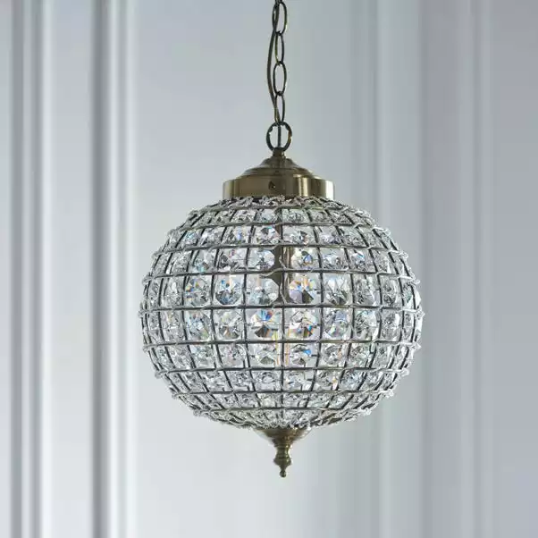 Boasting a stylish retro design, the Lelia Pendant fitting features a dome shaped cage shade suspended by a decorative chain, all in an antique brass finish with delicate clear glass bead details. This light fitting is also height adjustable at time of fitting, making it suitable for a range of spaces.
