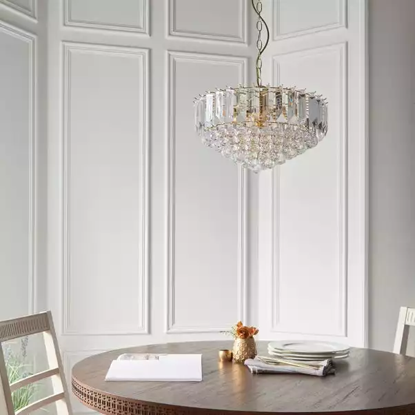 Finished in a brass effect with delicate clear acrylic detailing, the Tioga Pendant would make a glamorous addition to any home. This fitting has a height adjustable drop, is compatible with dimmer switches and suitable for use with LED lamps.